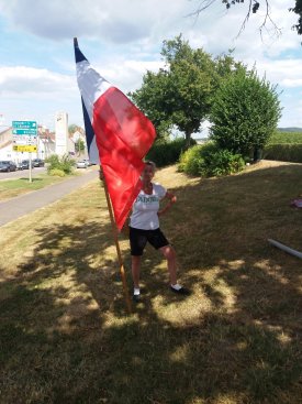 Gisteren zijn we onverwachts weer samengekomen voor een protest in Autun, We zouden bij het meer aan de rand van de plaats grote spandoeken ophangen tussen de bomen op het talud. Voor we echter klaar waren kwam de politie al om ons te sommeren onmiddellijk af te breken met het dreigement op een boete van 3.000 euro. We beschikten niet over -de juiste- vergunning. Intussen had Letty de wacht gehouden met de Franse vlag.