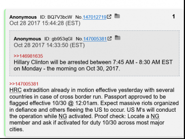 Waarschijnlijk een kort bericht of een afbeelding van Team Trump/Q/White Hats die de NWO-boeven de stuipen op het lijf joeg.