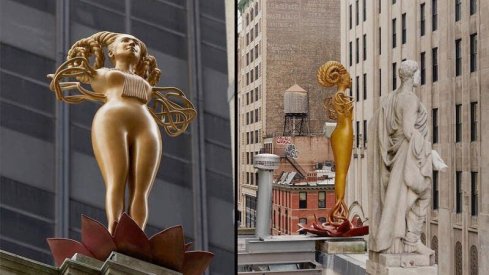 It's eight-foot sculpture of a gold horned female fused to a lotus flower with what appears to be tentacles has been erected above a state courthouse in New York City. The monstrous figure is adorned with what is supposed to be the late Supreme Court Justice Ruth Bader Ginsburg's lacy judicial collar.