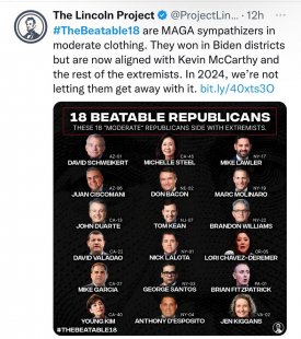 #TheBeatable18 are MAGA sympathizers in moderate clothing. They won in Biden districts but are now aligned with Kevin McCarthy and the rest of the extremists. In 2024, we’re not letting them get away with it.”