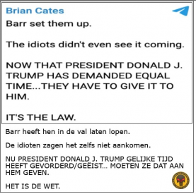 Wat Trump en zijn team (Bill Barr en Mike Pence) ook deden, was op 1 januari 2021 een bepaalde wet aanpassen, die wet werd zodanig in rode tekst aangepast dat in het geval 1 partij, democraten of republikeinen, met belastinggeld zendtijd bij de omroepen kopen om uitsluitend hun eigen eenzijdige verhaal naar buiten te brengen - zoals nu het geval is met het door de democraten opgezette comité waarbij zij de zogenaamde inval in het capitool op 6 januari 2021 onderzoeken - de tegenpartij, in dit geval Trump’s republikeinse partij, dezelfde hoeveelheid zendtijd op al die nieuwszenders ter beschikking moet krijgen om hun kant van het verhaal te vertellen.